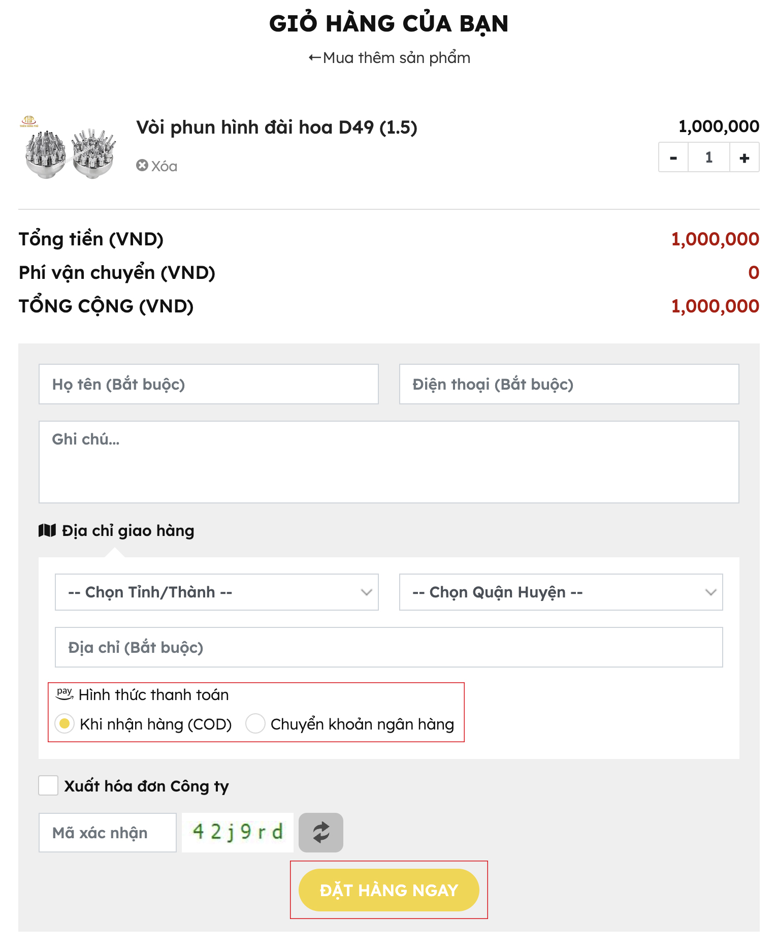 + Chọn vào nút ĐẶT HÀNG NGAY nếu bạn muốn thanh toán luôn toàn bộ giá tiền sản phẩm bằng tiền mặt, check vào phần Khi nhận hàng (COD) hoặc Chuyển khoản ngân hàng nếu bạn muốn mua hàng bằng cách chuyển khoản.